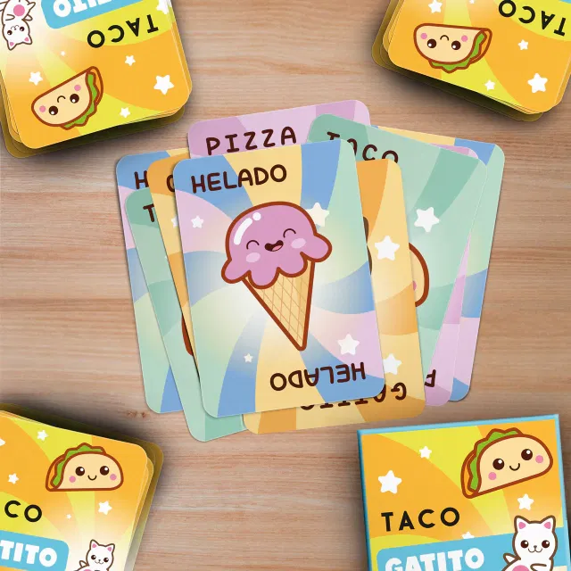 Primero, tenés que decir en voz alta una de las tres palabras del nombre del juego (la que quieras: taco, gatito o pizza) y después tenés que dar vuelta tu carta.