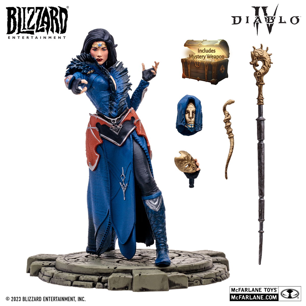Los accesorios incluyen cabeza intercambiable, 3 armas, base de exhibición y un arma misteriosa.