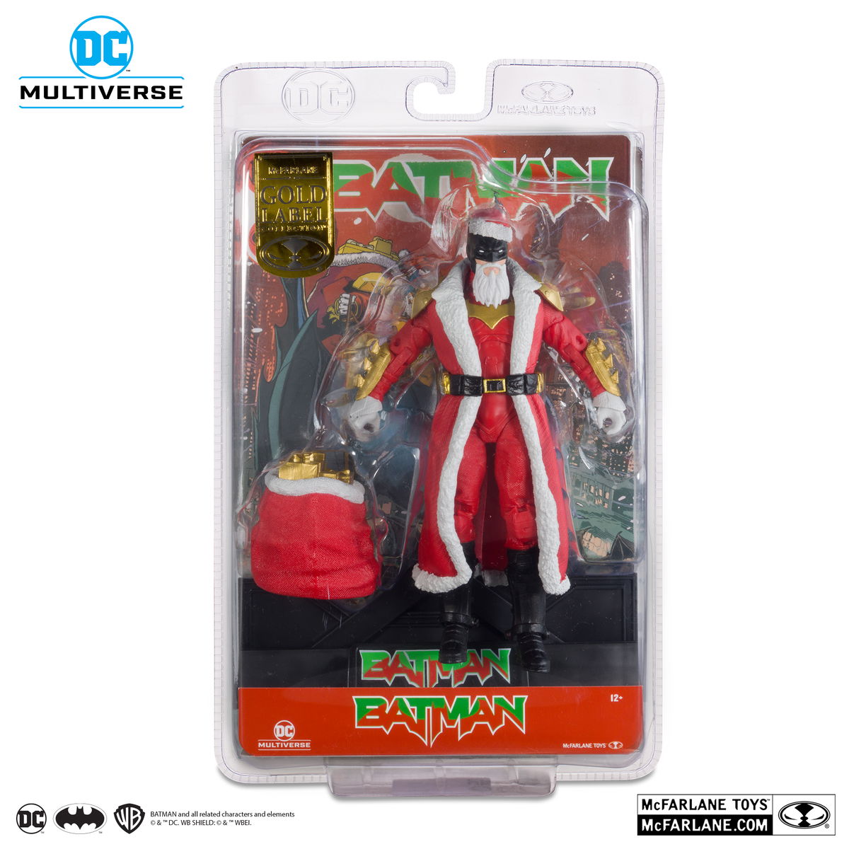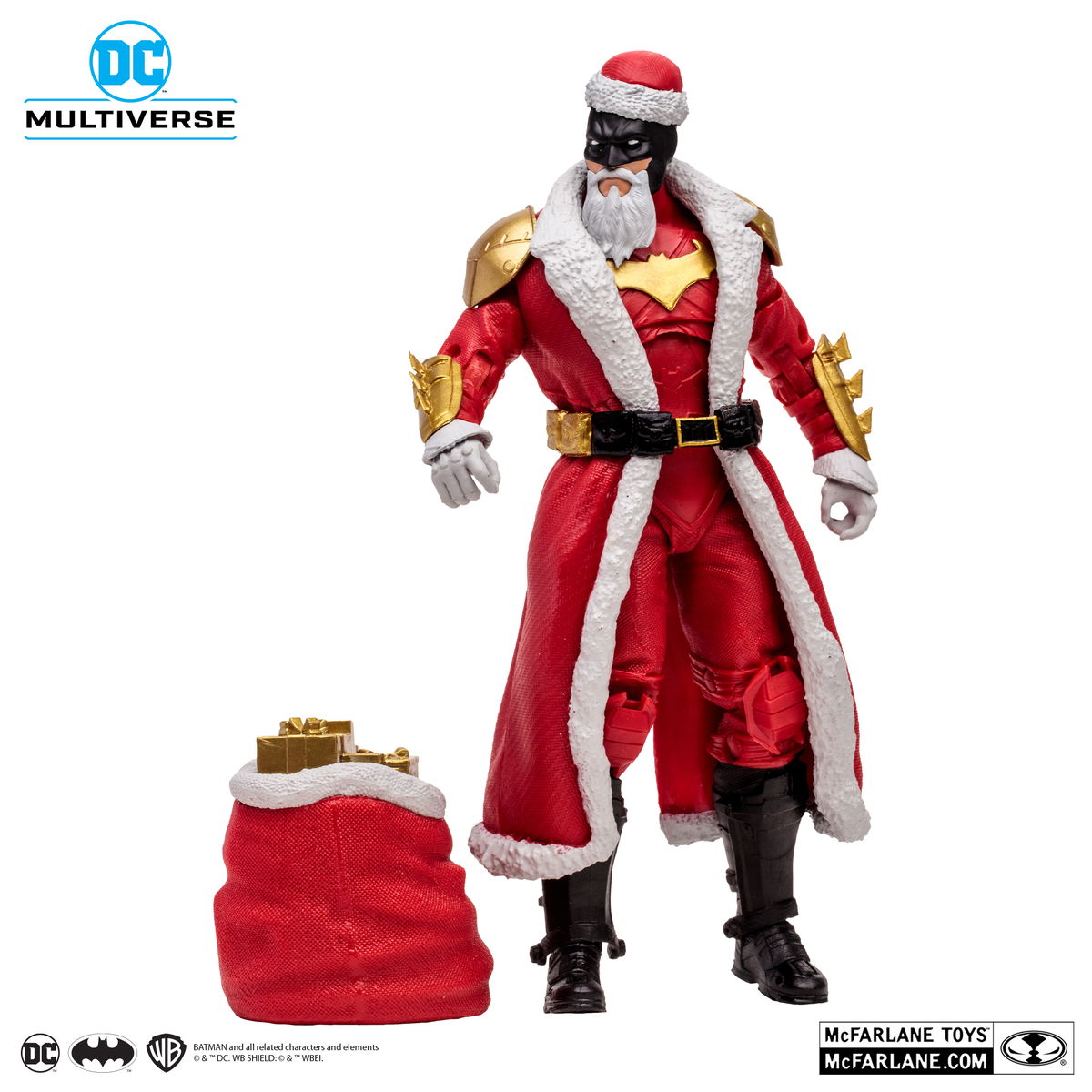 BATMAN™ está decorado con un atuendo festivo de color rojo y viene con una bolsa de regalos y una base para la figura.