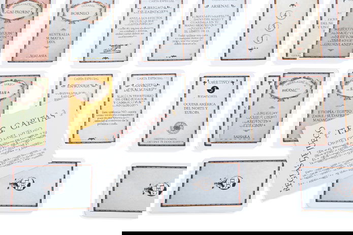 - Contenido de la caja: 21 cartas de OBJETIVOS SECRETOS, 40 cartas de TERRITORIOS, 16 cartas ESPECIALES, 56 cartas de DADOS, 4 cartas de TABLA DE CONTINENTES, 1 reglamento.