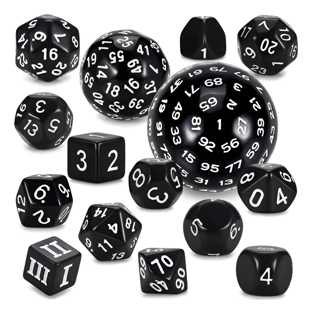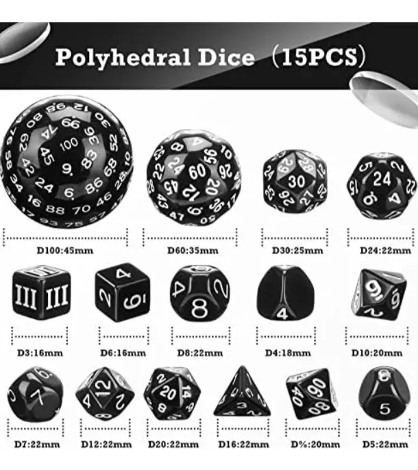 El paquete incluye: 15 dados poliédricos, contiene D3, D4, D5, D6, D7, D%, D8, D10, D12, D16, D20, D24, D30, D60 y D100, juego completo de dados para satisfacer tus necesidades de juego de mesa Duradero y fiable: los dados están hechos de material acrílico de alta calidad, duradero, suave, impermeable y resistente al desgaste, con gran solidez del color y sensación cómoda al tacto-