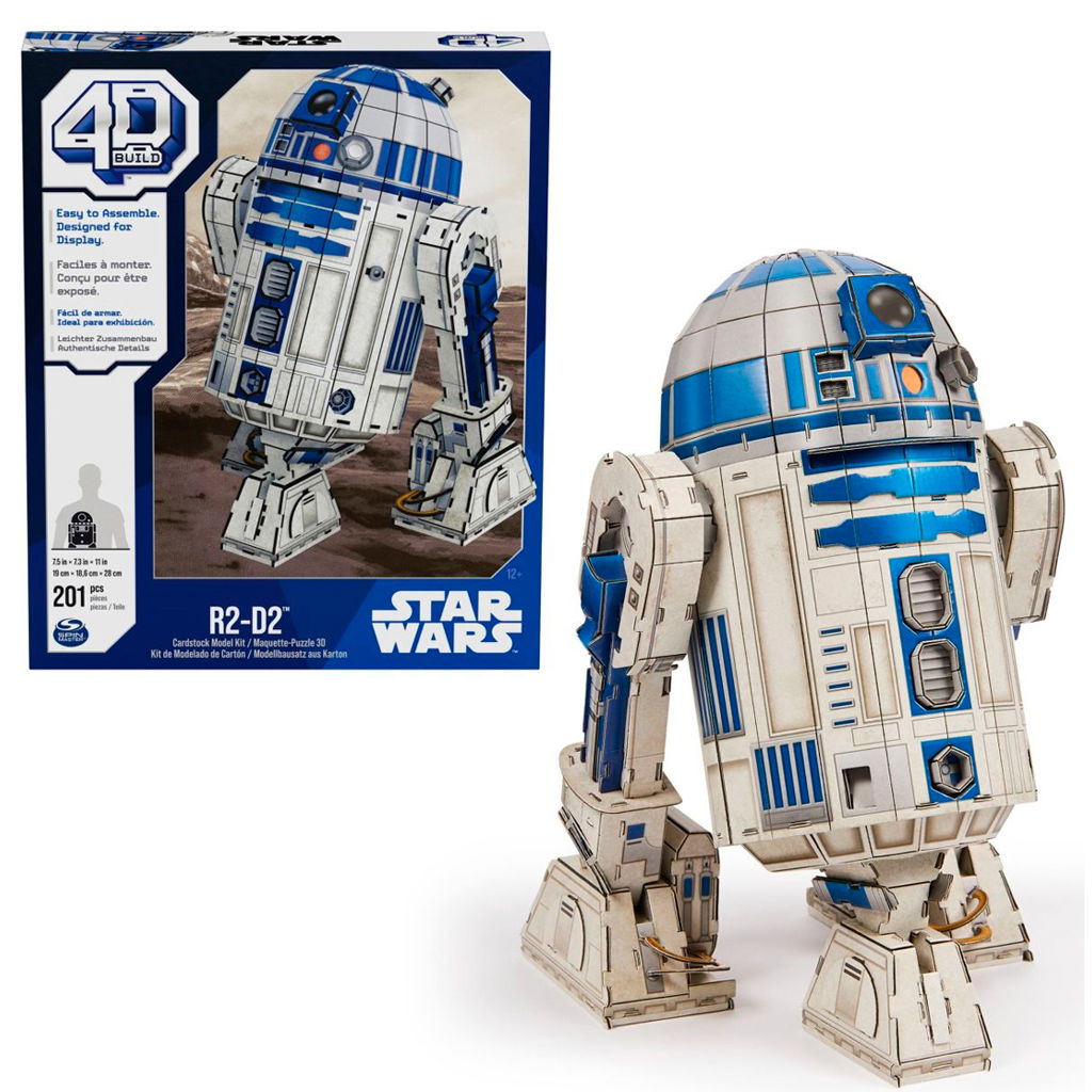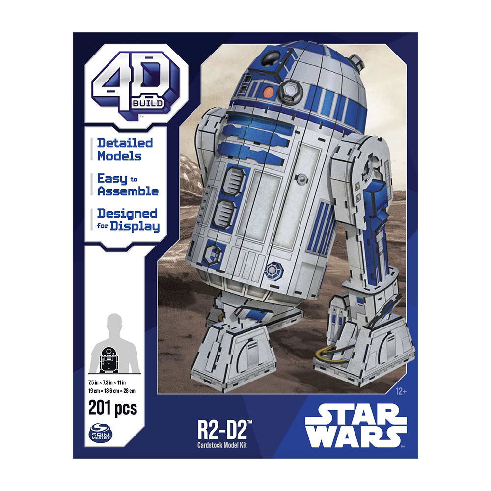 ¡Este modelo 4D Build incluye todos los detalles con calidad de película que reconocerás, además de pegamento y un soporte! Obtendrá 6 hojas con 201 piezas perforadas e instrucciones de fácil montaje. ¡No se requieren herramientas! R2-D2 mide 7,5 x 7,3 x 11 pulgadas (19 cm x 18,6 cm x 28 cm).