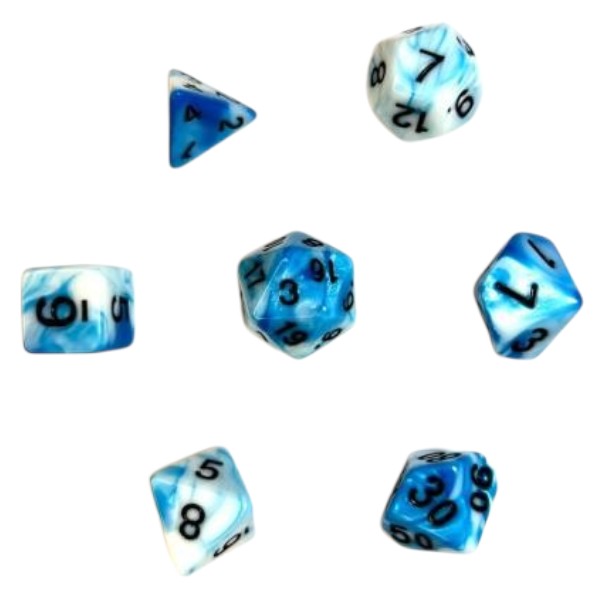 SET DADOS POLIEDRICOS X7 Celeste y Blanco