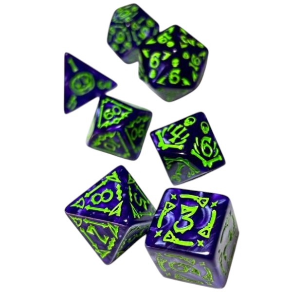 SET DADOS POLIEDRICOS X7 Violeta c/ verde